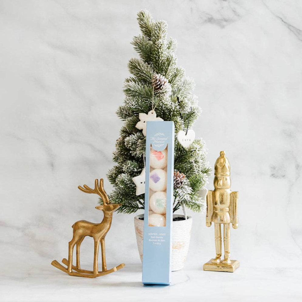 - 7 mini bath bombs with a variety of Holiday inspired scents