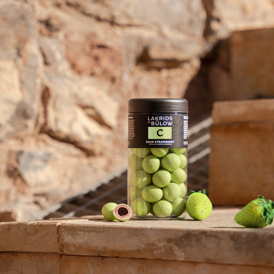 Imagine freshly picked green strawberries together with exquisite red liquorice in a sweet, fruity bite. Enjoy how fresh and sour notes from crispy, green strawberries are perfectly balanced with chewy red liquorice, all swirled in silky white chocolate and a crunchy, green sugar shell for an extra sour twist.