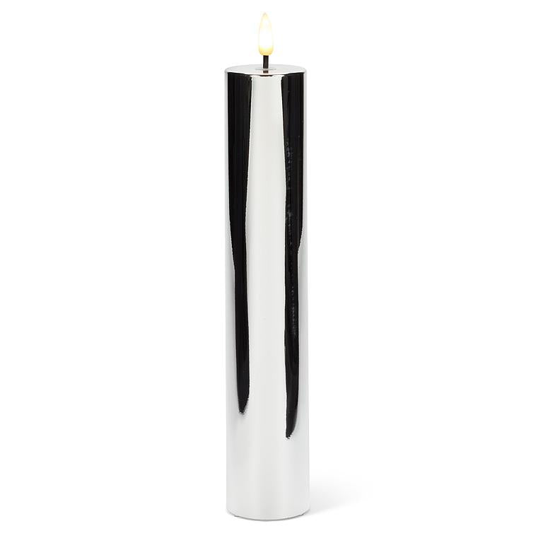 These elegant Silver LED Pillar Candles bring the warm glow of candlelight without any fear of fire or mess with. The metallic pillars features a realistic, pulsating 3D LED flame, with a run time of over 150 hours. Powered by 2 x AA batteries (not included), these safe, ambience-adding candles make a dazzling glow to any type of decor, either as singles or as a group. Available in four sizes, each having a 6-hour timer.