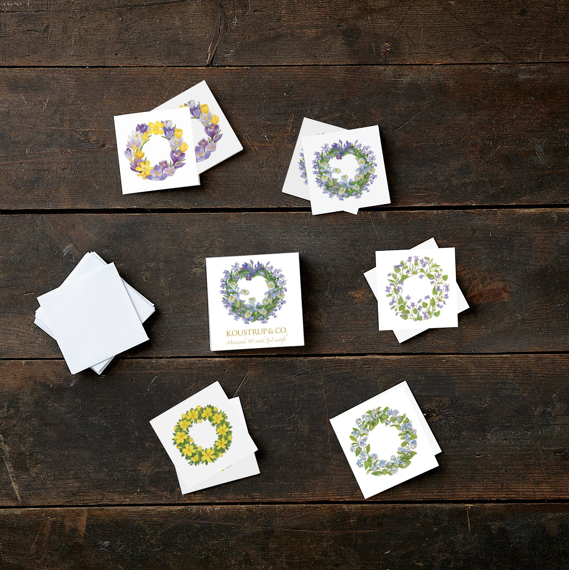 Square mini-cards with motifs of modern and atmospheric wreaths of beautiful flowers.