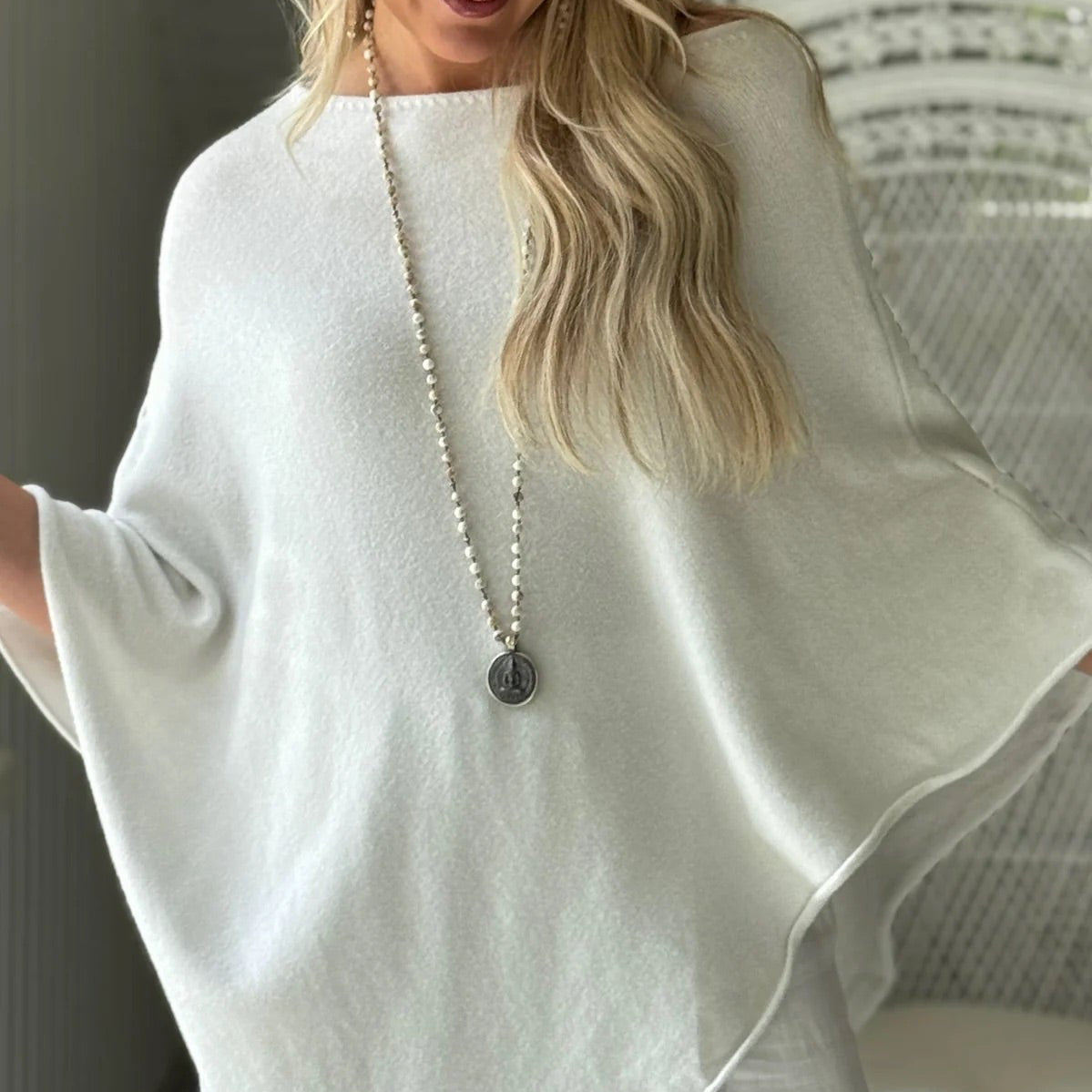 The perfectly shaped poncho is made from stretchy and luxuriously soft viscose knit. Suitable for year-round wear and won’t irritate even sensitive skin. The shade of silver is more white-silver color.
